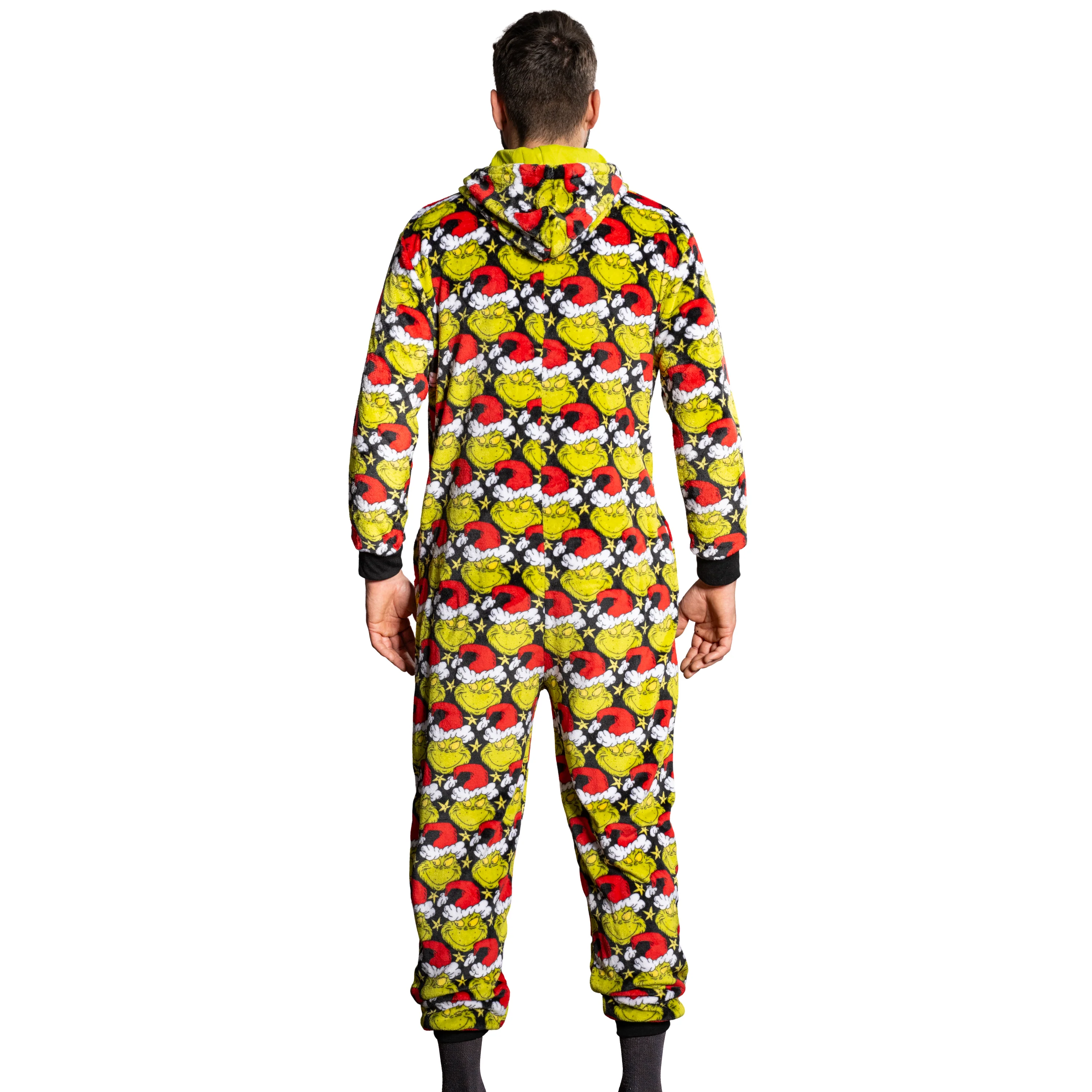 -70%Grinch with Santa Hat Face All Over Pajamas Jumpsuit Christmas Union Suit with Hood and Pockets for Mens and Womens—