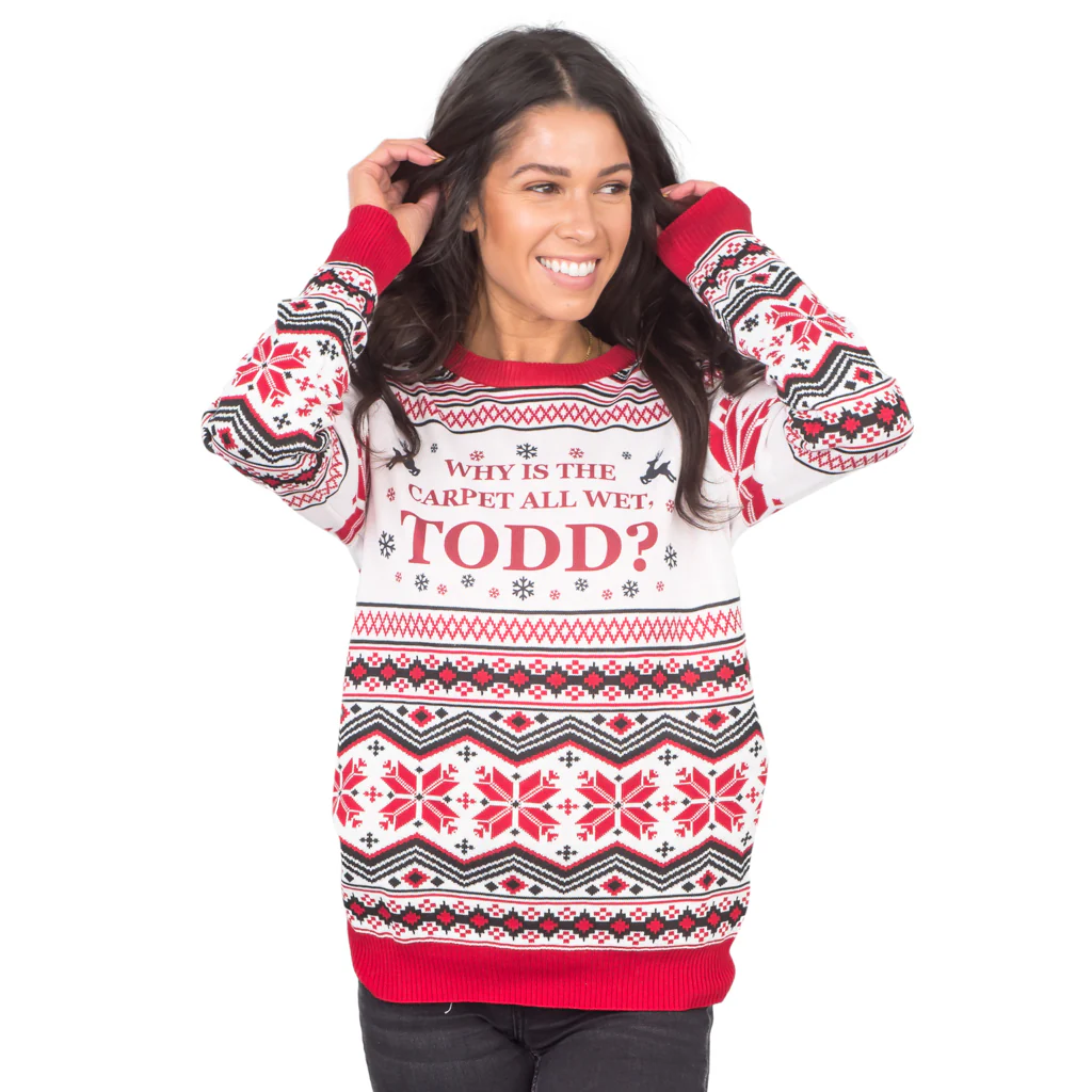 National Lampoon's Christmas Vacation Ugly Christmas sweater. Whether your favorite part of the movie is Chevy Chase going down the snow-covered hill on the space-age saucer slide screaming "Later, Dudes" or Cousin Eddie, or the squirrel in the tree that goes crazy, you can't discount the hilariousness of The Griswold's neighbors and all the hell that they go through next door as Chevy Chase tries to give his family the best Christmas ever. This "Why is the Carpet all Wet, Todd?" is a classic line from