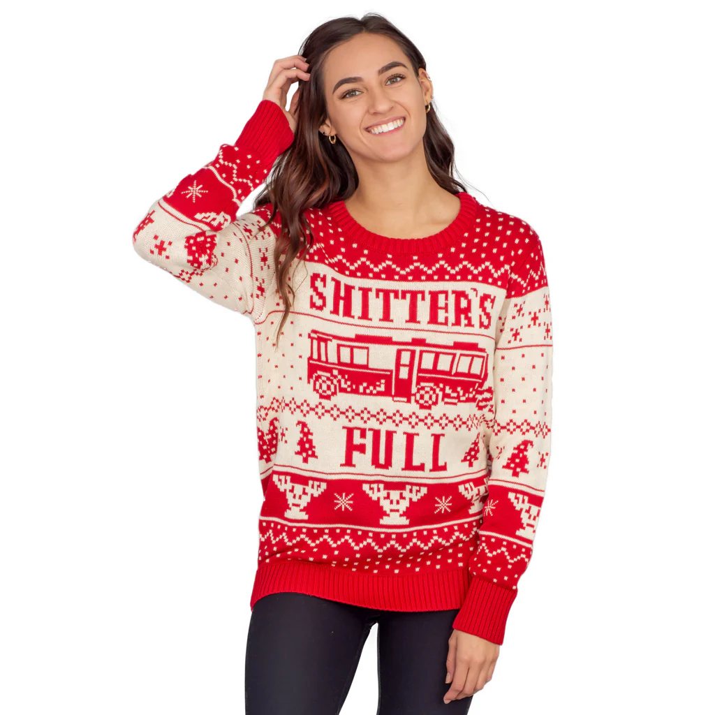 If there's one character from National Lampoon's Christmas Vacation that everyone laughs the most at its "Cousin Eddie" played by crazy actor Randy Quaid -- he's as tipsy as one of Santa's elves! And you don't laugh as hard as when Clark's uptight neighbor catches Eddie outside in the morning emptying the RVs septic tank into a street drain, to which Eddie responds, "Shitter's Full!" This hilarious Women's National Lampoon Vacation Shitter's Full ugly Christmas Sweater will have all your friends laughing this holiday season.